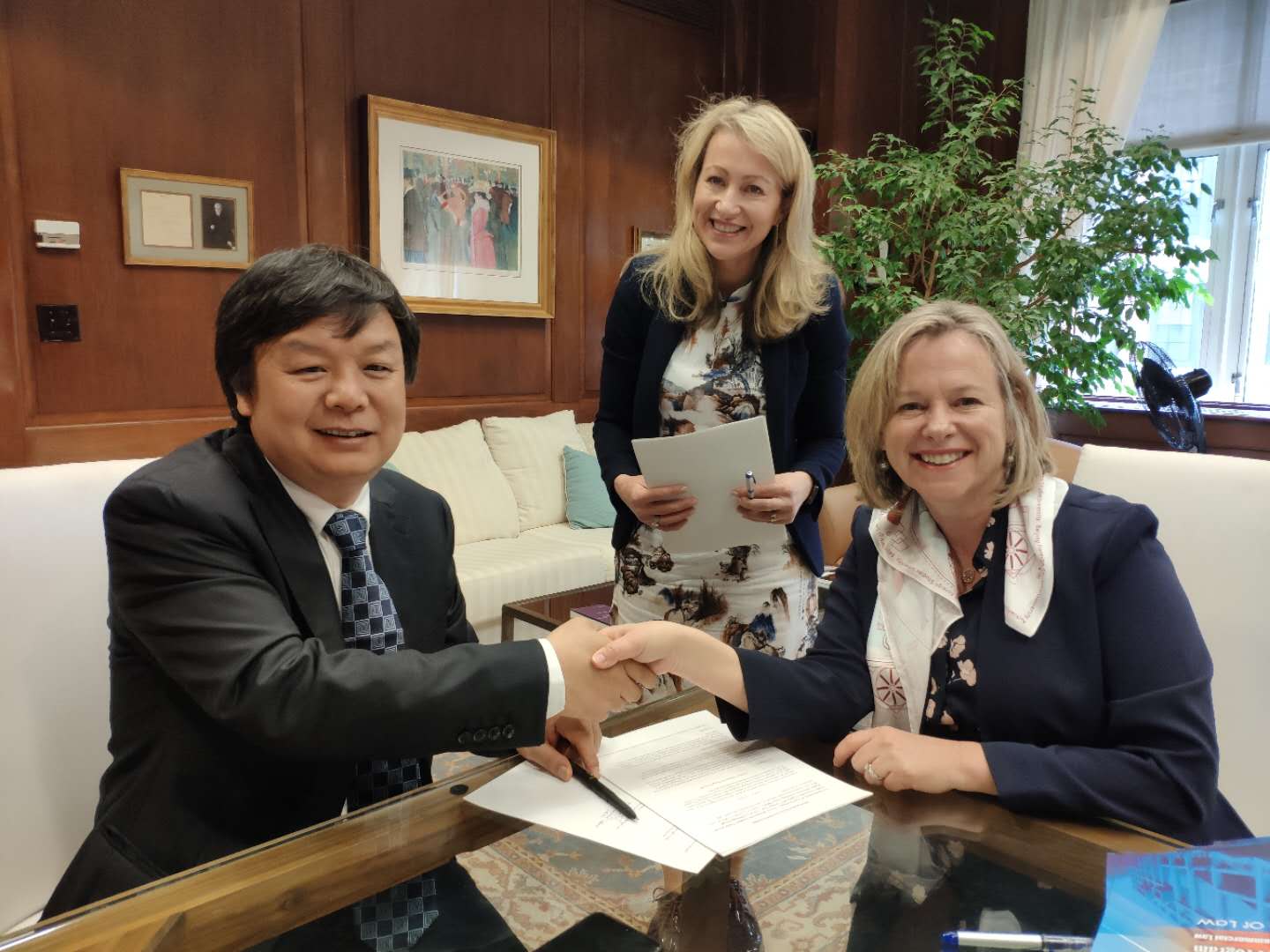 在卡多佐太阳成tyc33455cc官网,米良书记一行与梅来妮·莱斯利院长就两院合作进行了交流。双方就合办学术研讨会机制化、联合培养硕、博学生和利用暑假小学期积极开拓合作领域等提出了合作建议。米良书记介绍了北外太阳成tyc33455cc官网法学科硕士点及博士点及培养外国留学生情况,欢迎卡多佐太阳成tyc33455cc官网学生到北外攻读法学博士、硕士。梅来妮·莱斯利院长表示愿意与太阳成t官网就硕士研究生1+1+1培养模式开展合作。最后,米良书记与梅来妮·莱斯利院长就学生交换、协作培养、学术交流等议题签署合作备忘录,确立了两院正式合作关系。