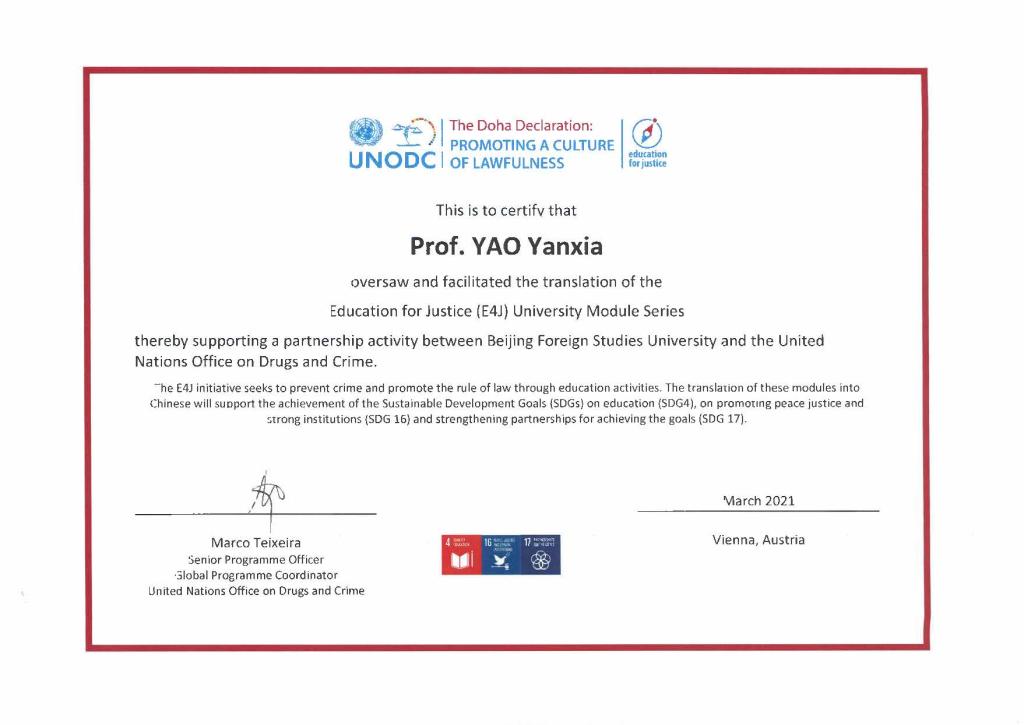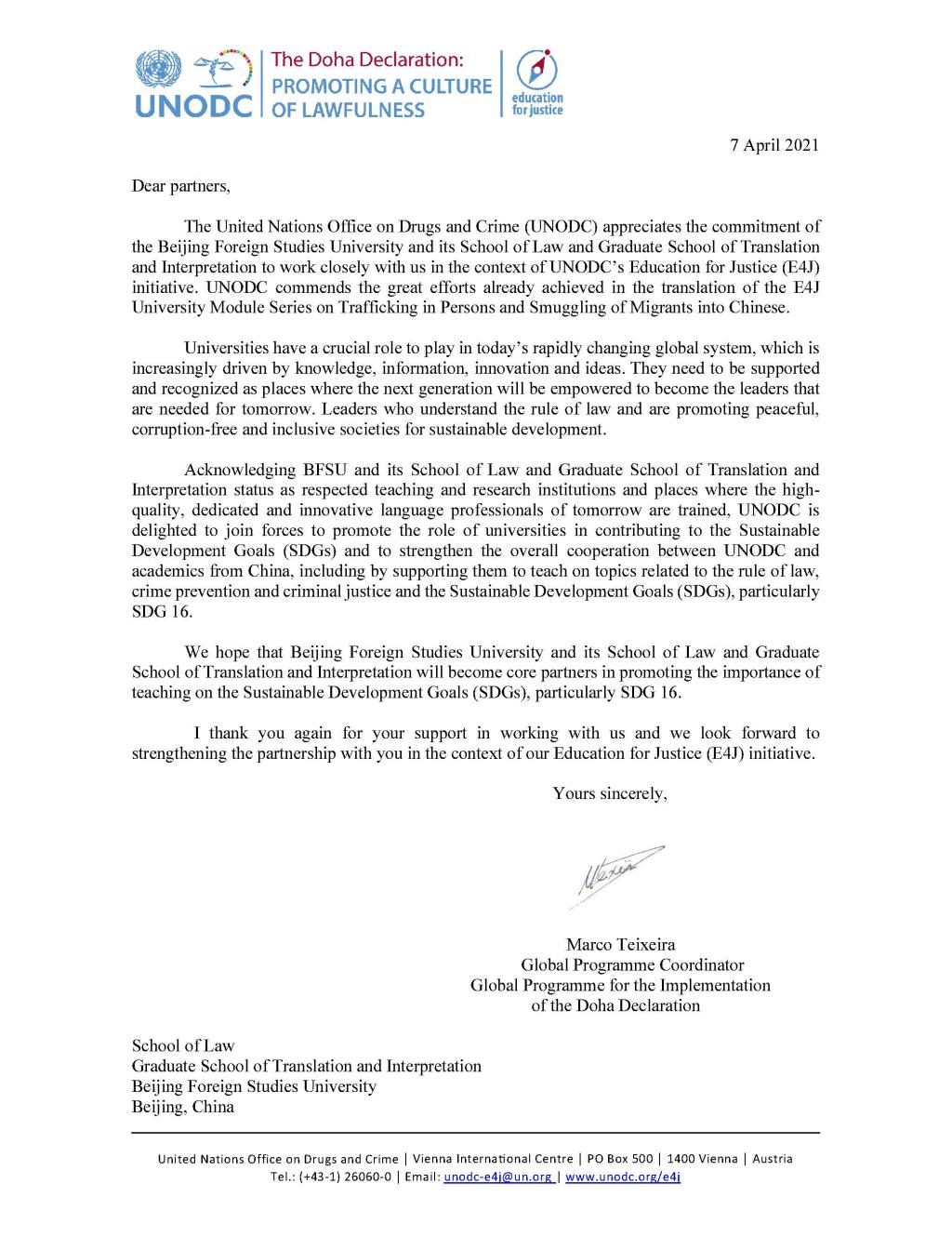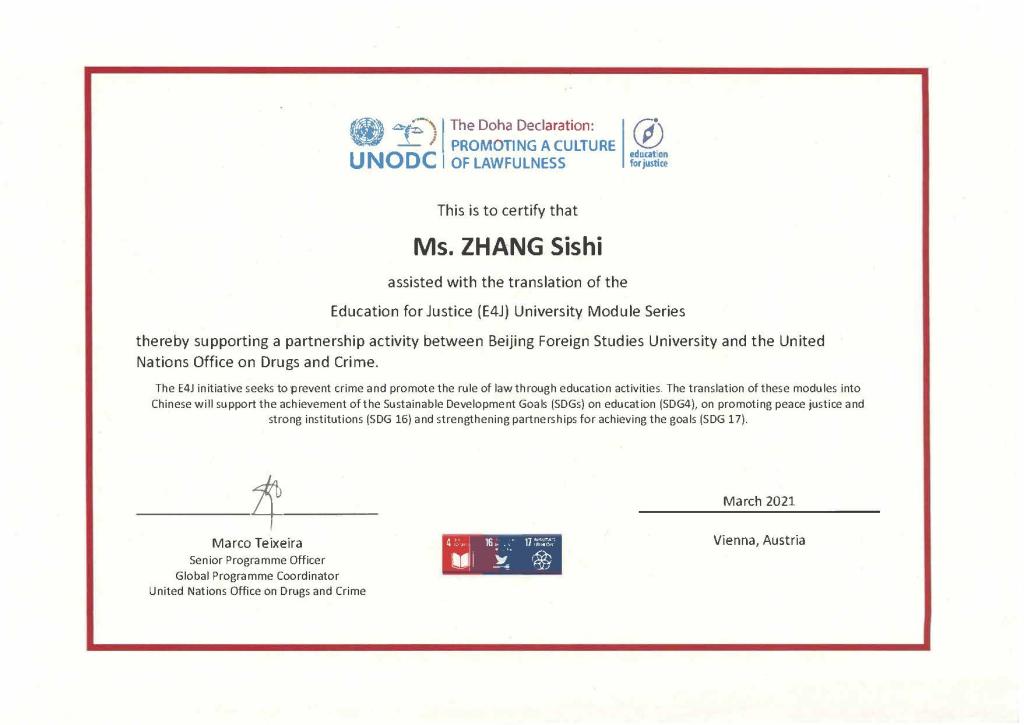 2021年4月8日下午,联合国毒品和犯罪问题办公室(UNODC)举行线上会议,感谢太阳成t官网和高级翻译学院师生在其“教育促进正义”(E4J:Education for Justice)项目中做出的突出贡献。