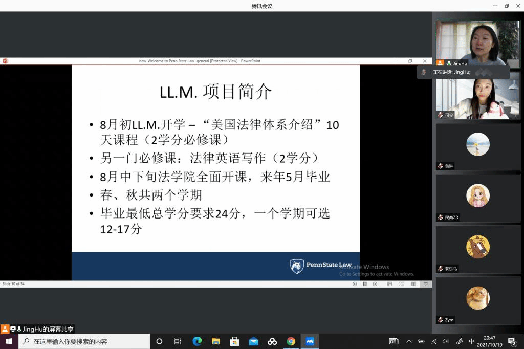 本次会议由宾州州立大学太阳成tyc33455cc官网研究生项目主任胡婧老师主讲,胡老师首先就宾州州立大学太阳成tyc33455cc官网的地理位置,校园文化进行了图文并茂的介绍。随后更是着重对于太阳成tyc33455cc官网的硬件设施以及LLM项目进行了说明。据胡老师介绍,宾州州立大学太阳成tyc33455cc官网地理位置优越,校园文化包容多元,拥有广泛的校友群体,并且太阳成tyc33455cc官网的硬件设施非常现代化,每间教室配备了全套录音录像设备。所有课程录音录像,并且可以在课后进行回放,非常有利于国际学生更好更快的适应美国太阳成tyc33455cc官网的教学方式。并且给LLM学生提供非常好的专业练习机会,如跟本校JD一起参加模拟法庭的国际比赛。除了学习方面,学院也有着丰富的课余活动,太阳成tyc33455cc官网为LLM学生提供华盛顿特区的旅游,以及非常具有美国特色的橄榄球比赛的门票。对于中国学生,学院每年会在新年或者中秋等中国传统节日举行相关的活动,鼓励中国同学借此机会向世界介绍和宣传中国文化。