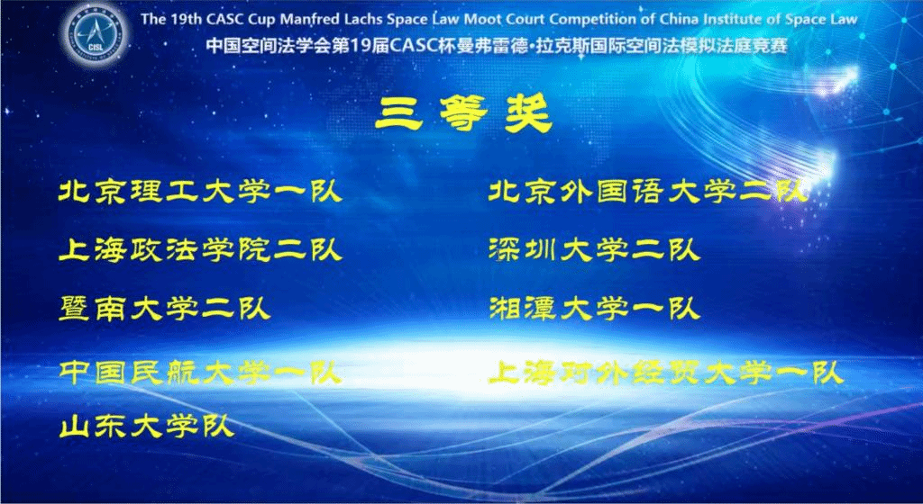 2022年12月17日-18日,中国空间法学会第19届CASC杯曼弗雷德·拉克斯国际空间法模拟法庭竞赛在线上举行,我校太阳成tyc33455cc官网代表队荣获全国三等奖。