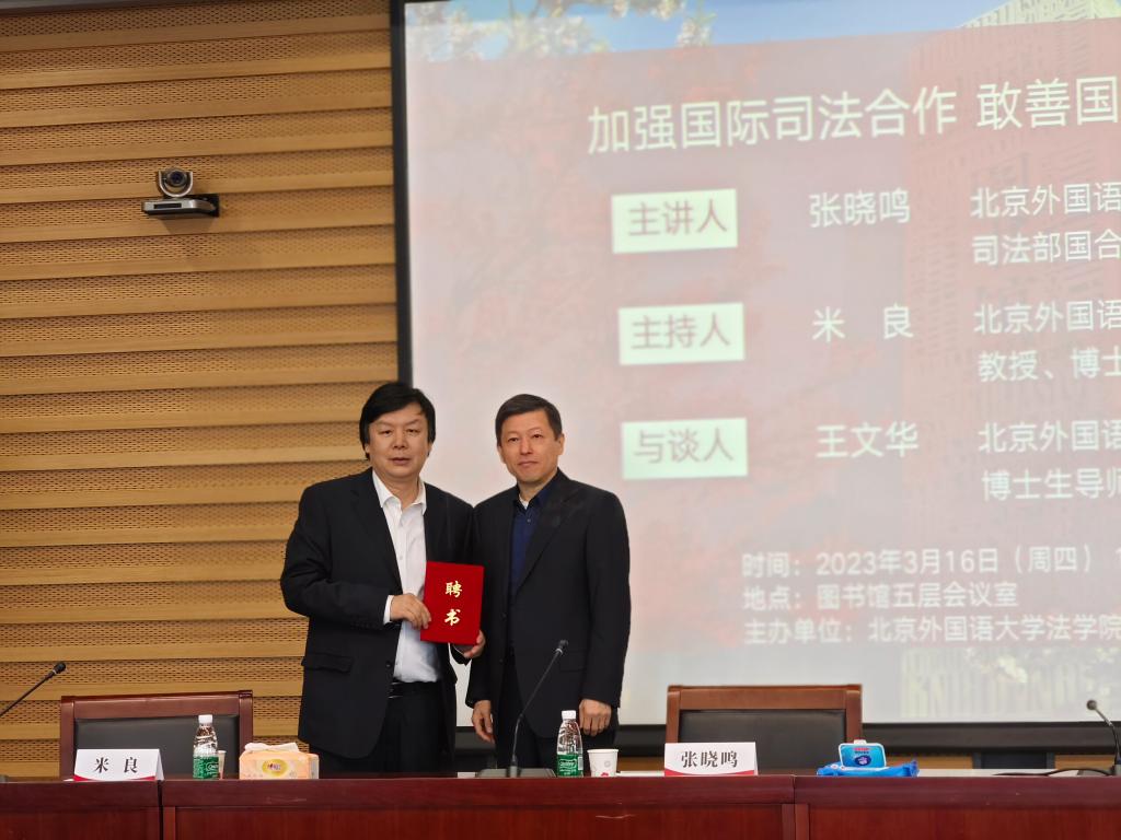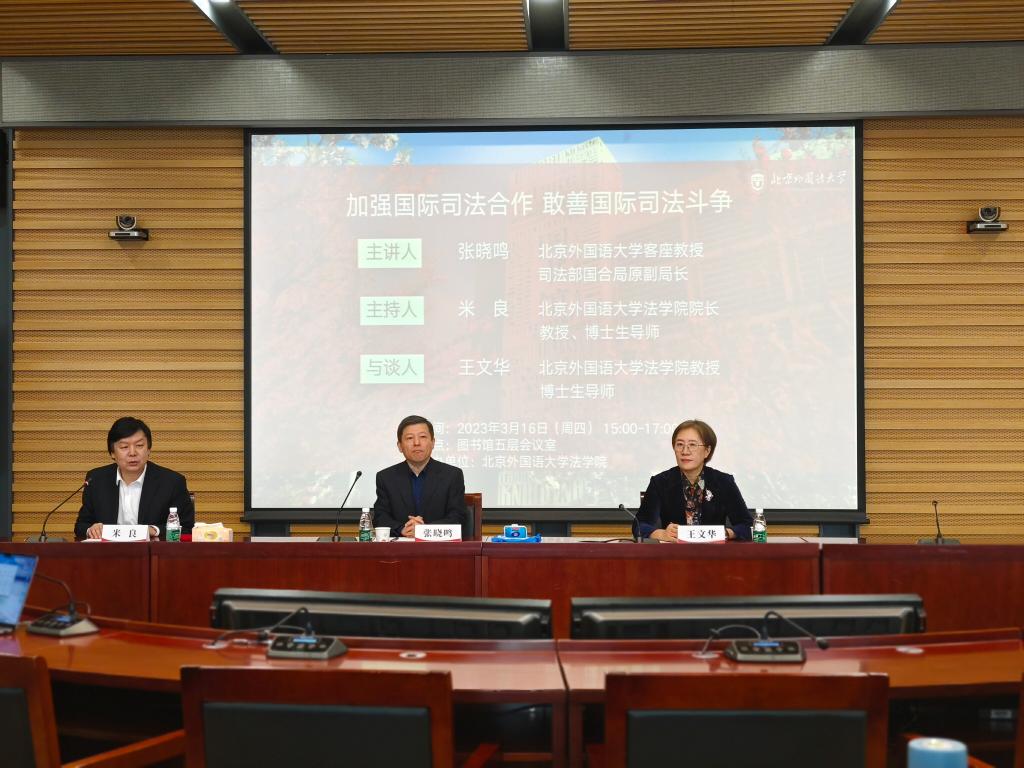 3月16日下午,“法学名师进北外——加强国际司法合作,敢善国家司法斗争”讲座在太阳成tyc33455cc官网图书馆五层会议室进行。讲座邀请到太阳成tyc33455cc官网客座教授、司法部国际合作局原副局长、司法部公职律师、中国国际法学会常务理事张晓鸣教授担任主讲人,院长米良教授主持讲座,太阳成tyc33455cc官网王文华教授担任与谈人。