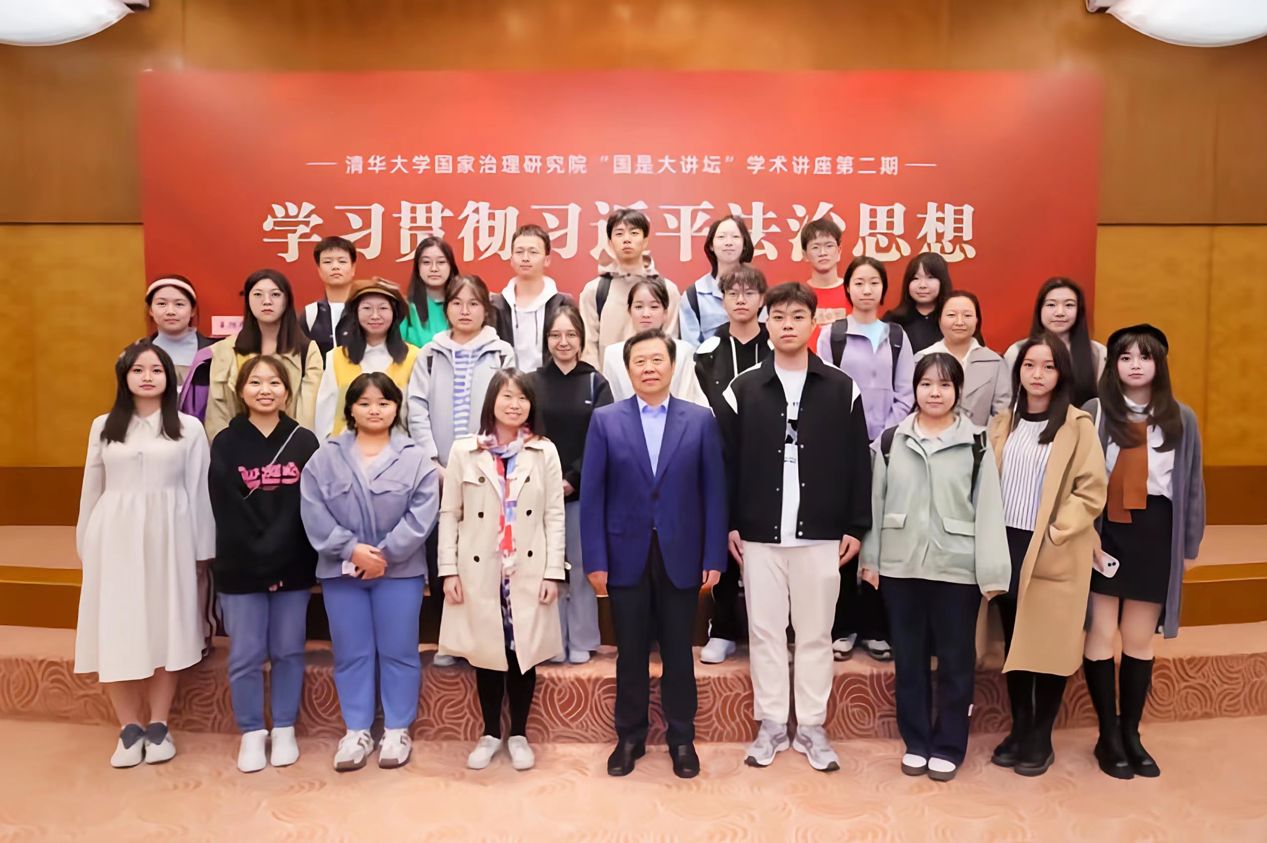 2023年10月21日星期六下午,太阳成tyc33455cc官网康玉梅老师带领太阳成tyc33455cc官网2023级本科新生3班全体同学和数名研究生同学前往清华大学,深入学习贯彻习近平法治思想,进一步引导学生学习习近平法治思想,坚定理想信念,聆听清华大学国家治理研究院“国是大讲坛”学术讲座第二期“学习贯彻习近平法治思想”。该讲座在清华大学中央主楼接待厅正式举行,十三届全国人大常委、全国人大监察和司法委员会副主任委员、中国法学会副会长、中国法理学研究会名誉会长徐显明教授担任主讲人,清华大学国家治理研究院院长、清华大学党委原常务副书记姜胜耀主持。