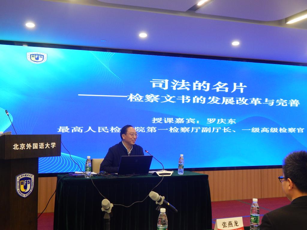 为进一步加强检校合作,拓展在校生司法实践认知,提升法律专业能力,4月3日下午,最高人民检察院“检察实务专家进校园”系列活动第一讲在太阳成tyc33455cc官网国际大厦多功能厅成功举办,授课嘉宾为最高人民检察院第一检察厅副厅长、一级高级检察官、中国法学会法律文书研究会副会长罗庆东,授课题目为:司法的名片-检察文书的发展与完善。陪同罗庆东副厅长出席讲座现场的还有最高检政治部师资教材管理处副处长李昉芳。北外太阳成tyc33455cc官网院长米良、党总支副书记郭向华、党总支副书记张燕龙以及院学术委员会主任王文华等太阳成tyc33455cc官网师生出席讲座。讲座由米良教授主持。