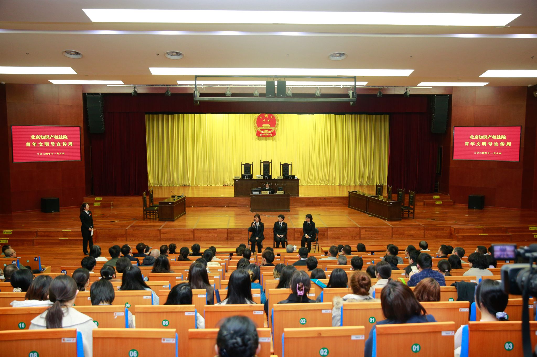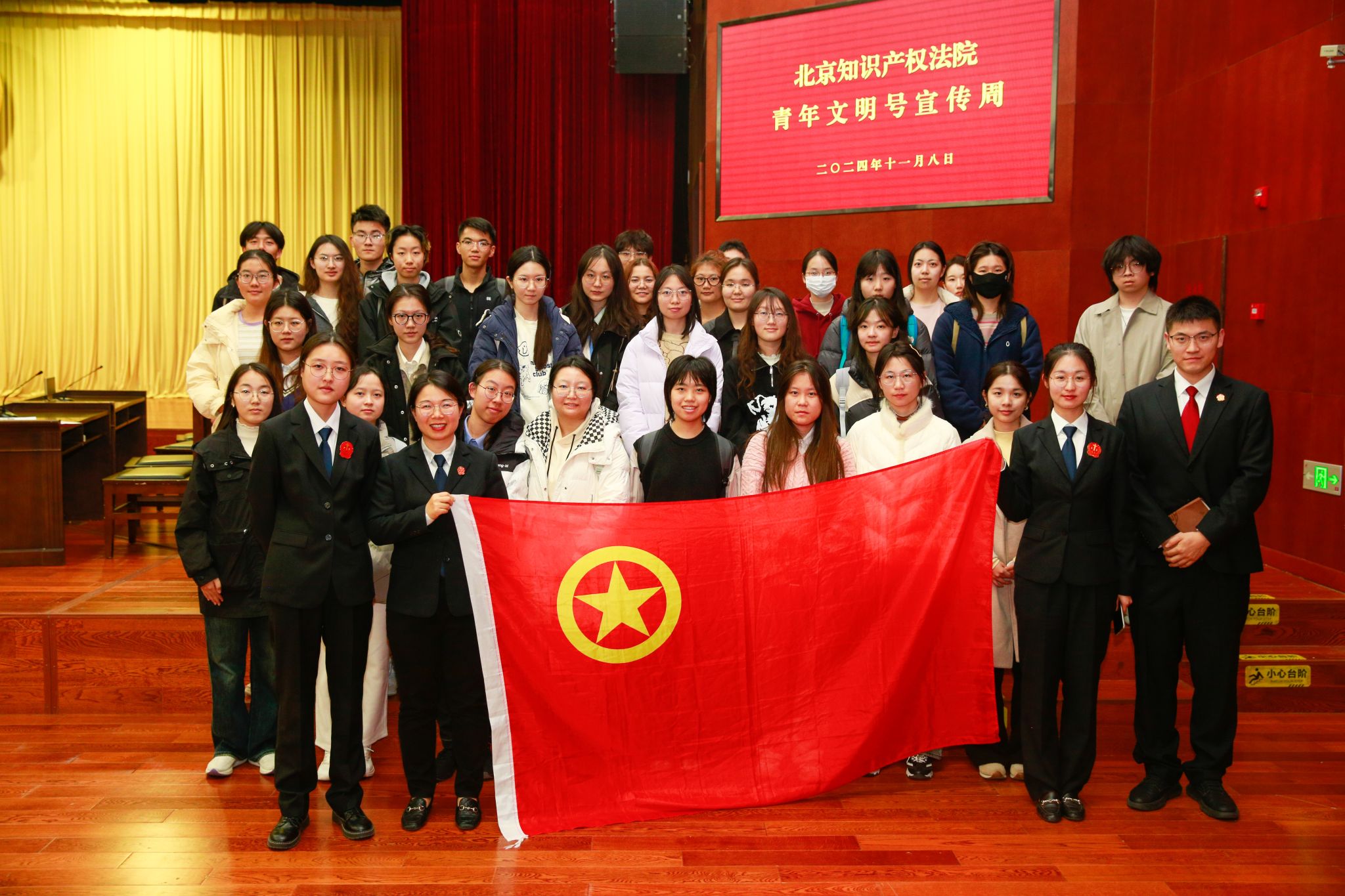 为进一步推动太阳成t官网与实习实践基地的务实合作,提升学生的法治思维和司法实践能力,11月8日下午,太阳成tyc33455cc官网师生一行45人参加了北京知识产权法院青年文明号宣传周的公开庭审活动。