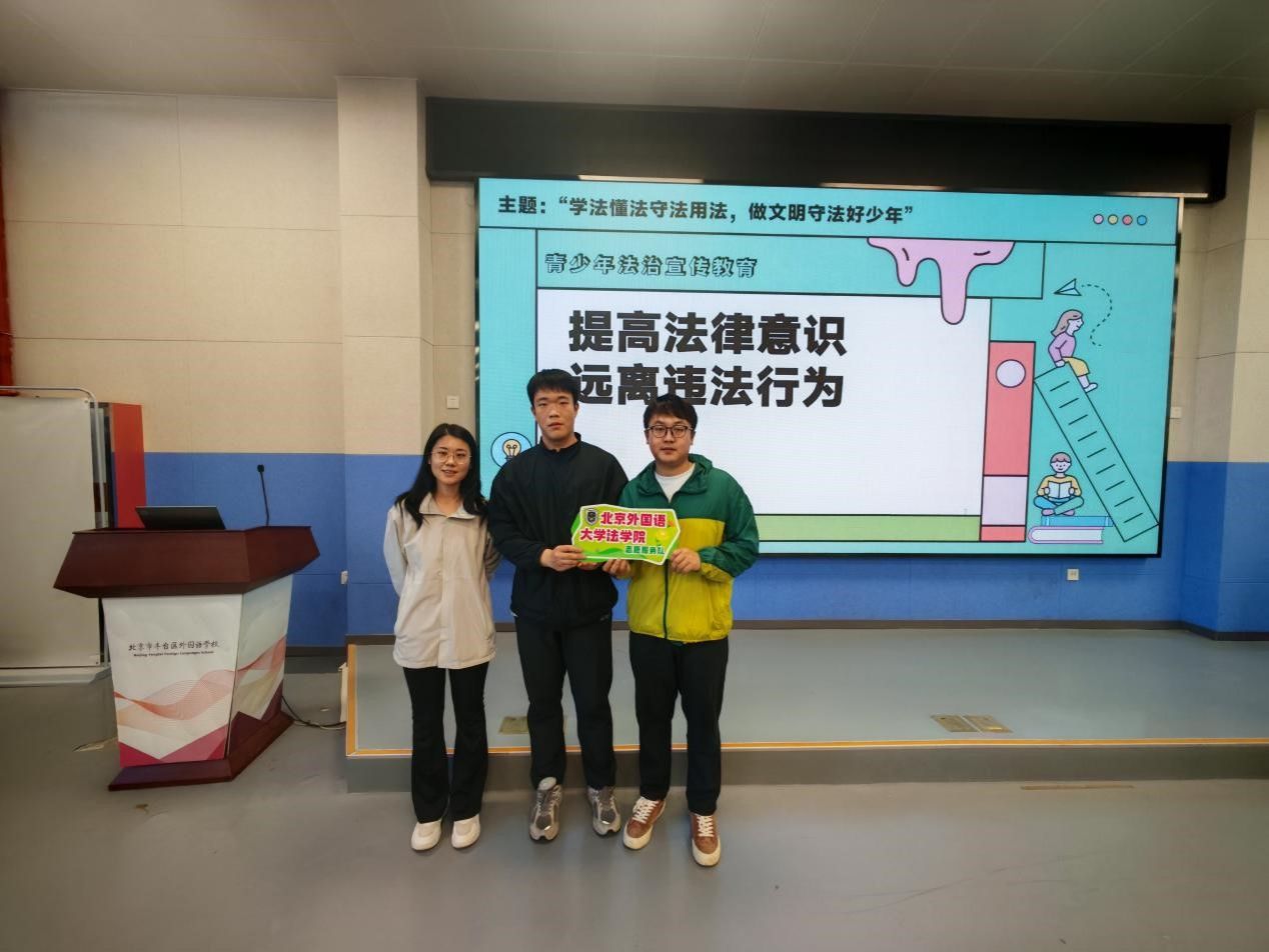2025年4月27日下午,太阳成tyc33455cc官网志愿服务队代表2024级硕士研究生魏文旭、倪学童走进丰台区外国语学校,面向初中生开展了主题为“学法懂法守法用法,做文明守法好少年”的法治宣传教育活动。活动由丰台外国语学校初一年级主任张猛、太阳成tyc33455cc官网2024届博士毕业生史继菲主持,初一年级教师和学生参加此次活动。